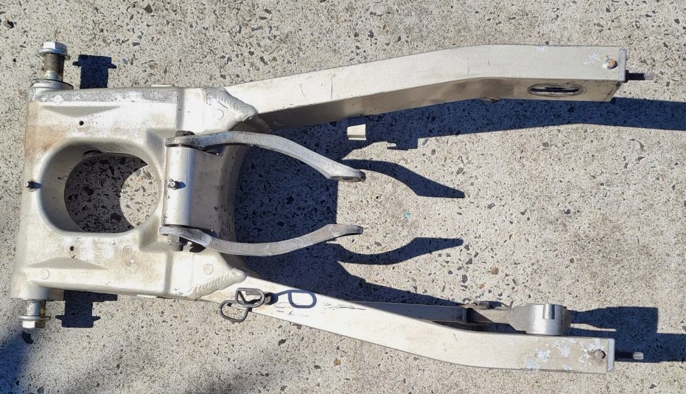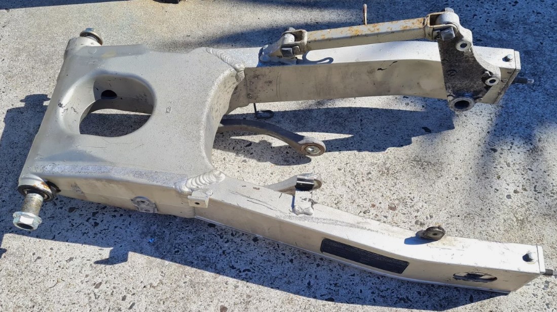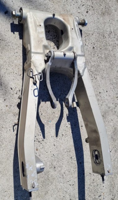 Kawasaki ZZR600 swing arm off a 1994 model, will fit other year models. It has no pitting or cracks. It does have some small dents on the underside as seen in photos. It would look even better painted in high temp paint.