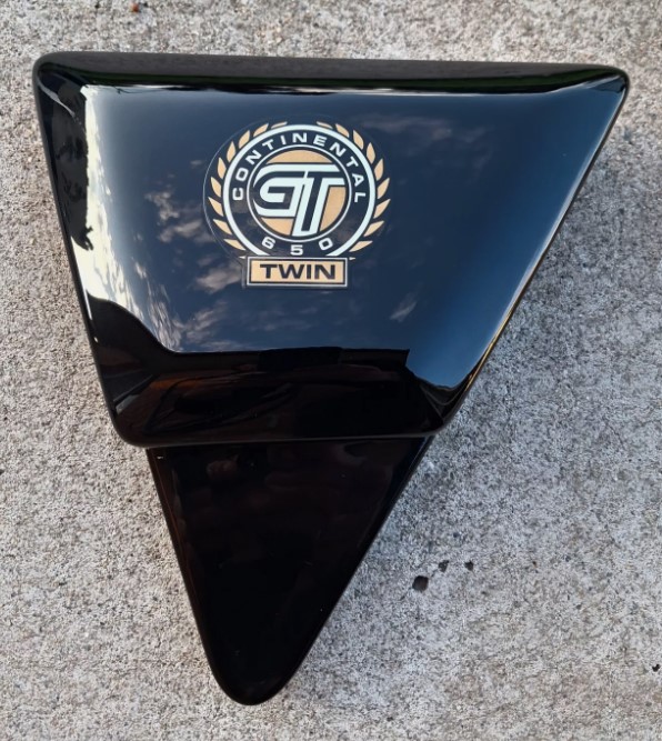 Royal Enfield Continental GT650 left side (Air Filter), side cover in good used condition. Looked great on the bike but when it was removed from the bike it had a light buff mark up close in the right light, that will likely polish out. Removed from a 2022 Royal Enfield continental GT650.