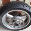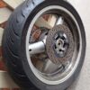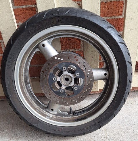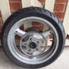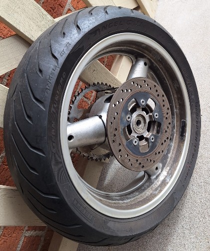 ISuzuki SV650 complete rear wheel. in good used condition. All parts in photos included, sprocket, brake rotor, Axle with spacers and tyre (it is a bit squared off but is included free). Fits all Gen 1 SV650 1999-2002.