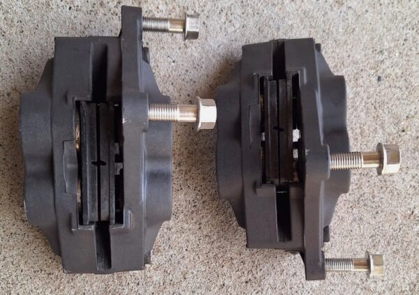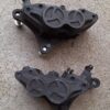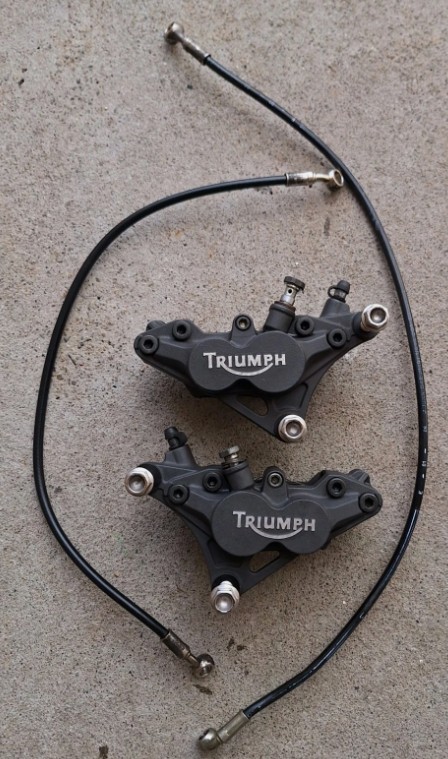 Triumph 1050 Sprint St front brake calipers. In good used condition. Brake pads are still in good usable condition, brake lines also included in sale. Removed from a 2006 model, compatible with other year models, if unsure please contact us.
