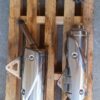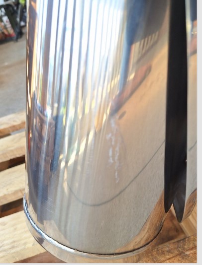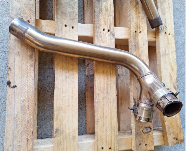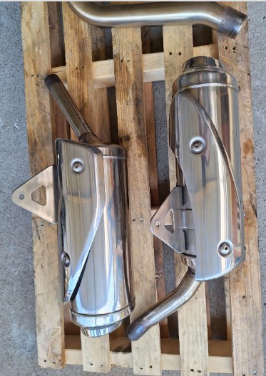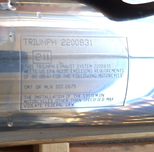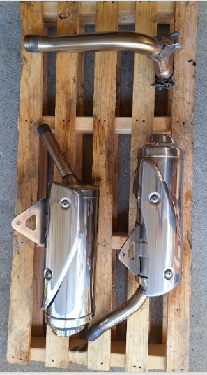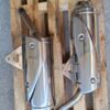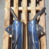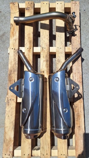 Triumph 675 Street Triple standard mufflers and link pipe. In good used condition. The left side has a light scratch as shown in last photo but wasn’t noticeable on the bike.